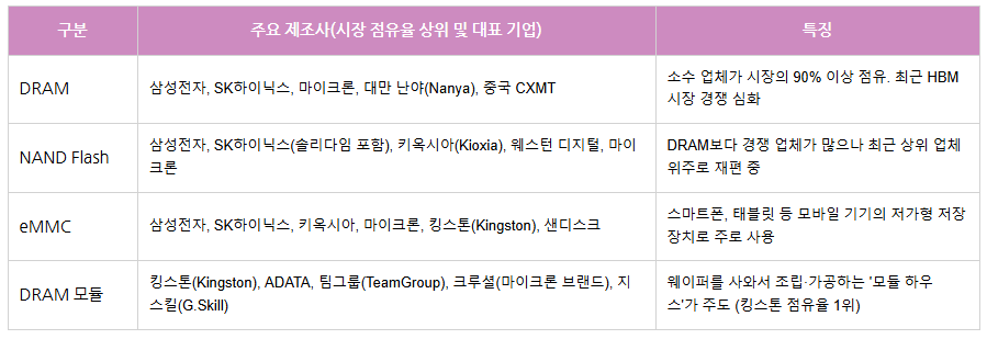 가장 기술 진입 장벽이 높은 분야입니다. 최근 AI 서버에 들어가는 HBM(HBM3E, HBM4) 시장이 핵심이며, SK하이닉스가 선도적인 점유율을 기록하고 있고 삼성전자와 마이크론이 뒤를 쫓으며 점유율 전쟁을 벌이고 있습니다. 중국의 CXMT가 정부 지원을 바탕으로 범용 DRAM 시장에서 점유율을 조금씩 높여가고 있습니다.
