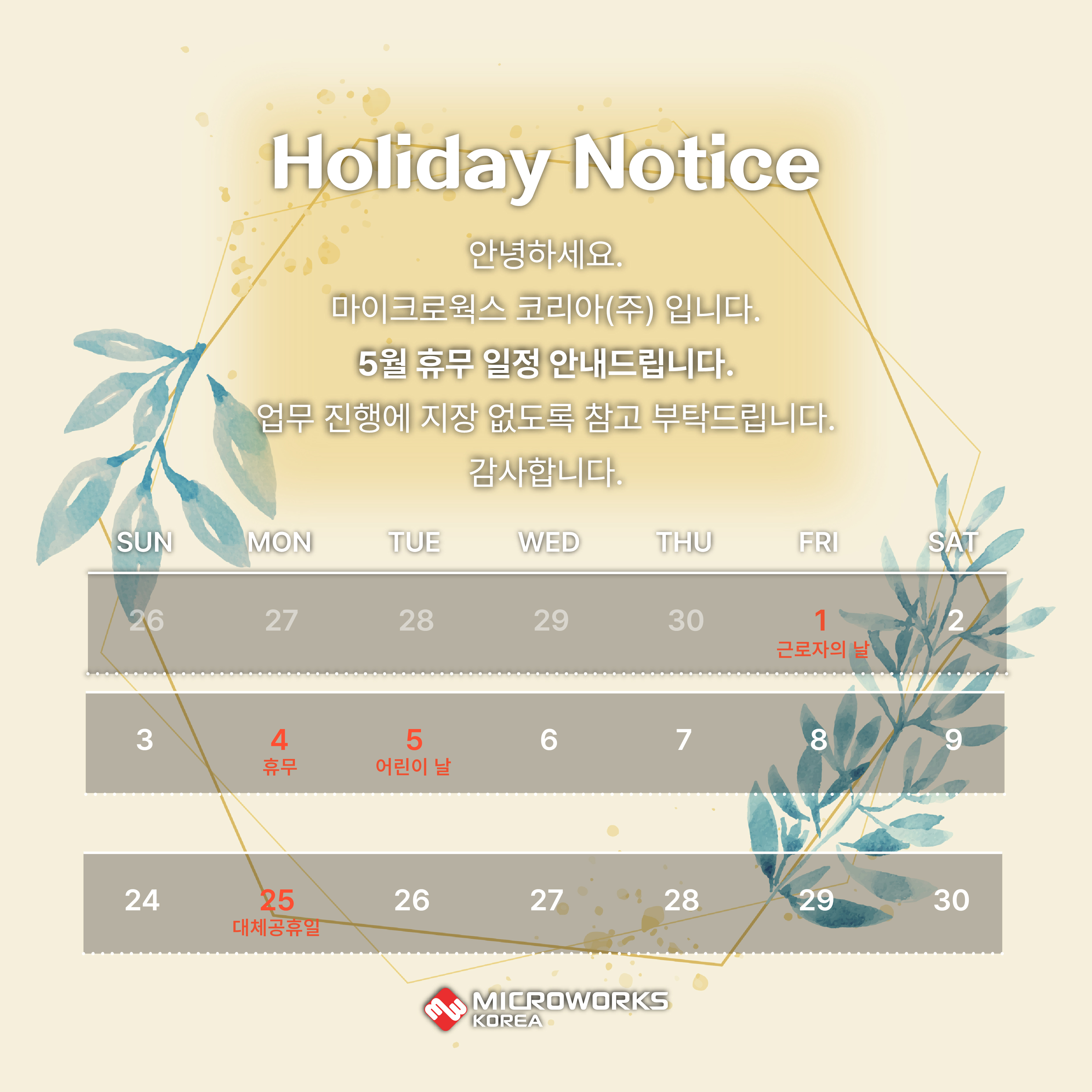 마이크로웍스 코리아(주) 5월 휴무일정 안내안녕하세요.마이크로웍스 코리아(주) 입니다.당사 5월 휴무 일정을 안내해 드립니다.업무 진행에 지장 없도록 참고 부탁드립니다.감사합니다. 목록